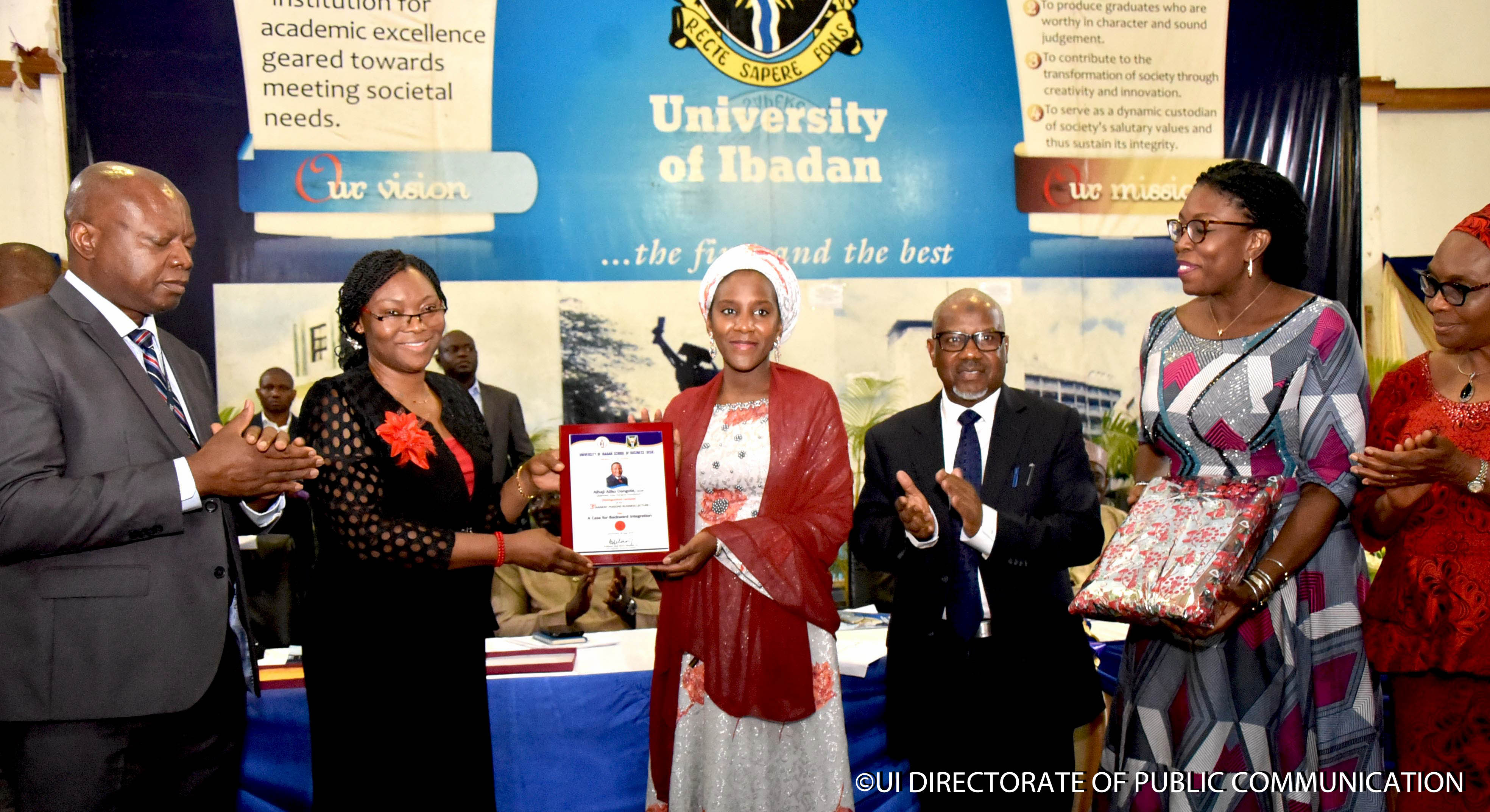 University of Ibadan School of Business 3rd Eminent Persons Business Lecture delivered by the Chairman, Aliko Dangote Foundation (ADF), Alhaji Aliko Dangote, GCON represented by Eng. Ahmed Mansur in the Trenchard Hall, University of Ibadan, Ibadan, on Wednesday, 25 July, 2018. Present at the Occasion were the representative of the Executive Governor of Oyo State/Commissioner for Education, Prof. Adeniyi Olowofela; UI Pro-Chancellor, Waklek Mutka; Principal Officers led by the Vice-Chancellor, Prof. Idowu Olayinka; UISB Management led by the Director, Prof. Adenike Osofisan; Lecturer’s representative/Executive Director, Stakeholder, Management & Corporate Communication, Dangote Industries Limited, Eng. Ahmed Mansur; Member, Board of Trustees of the Foundation, Hajiya Halima Aliko Dangote; MD/CEO of the Foundation, Mrs. Zouera Youssoufou; Director, Dangote Business School, Prof. Murtala Sagagi; Oluwo of Iwo, Oba Abdulrasheed Adewale Akanbi and other dignitaries.