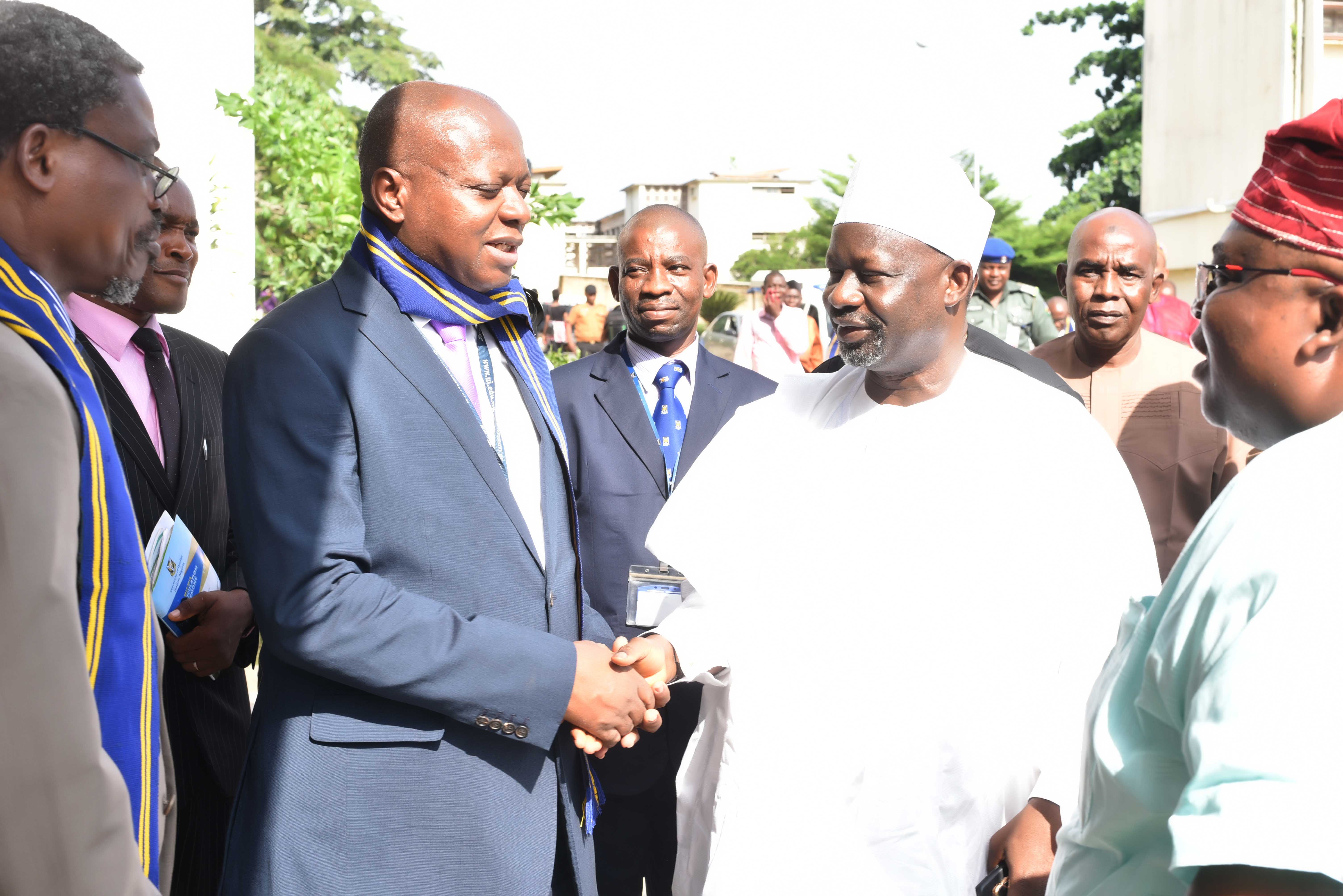 Vice-Chancellor, University of Ibadan, Prof. Idowu Olayinka welcoming The Gombe State Governor, His Excellency, Alh. Ibrahim Hassan Dankwambo to his office while Deputy Vice-Chancellor (Administration), Prof. EmilOlorun Aiyelari (left) and the National President,University of Ibadan Alumni Association, Dr. Kemi Emina look on
